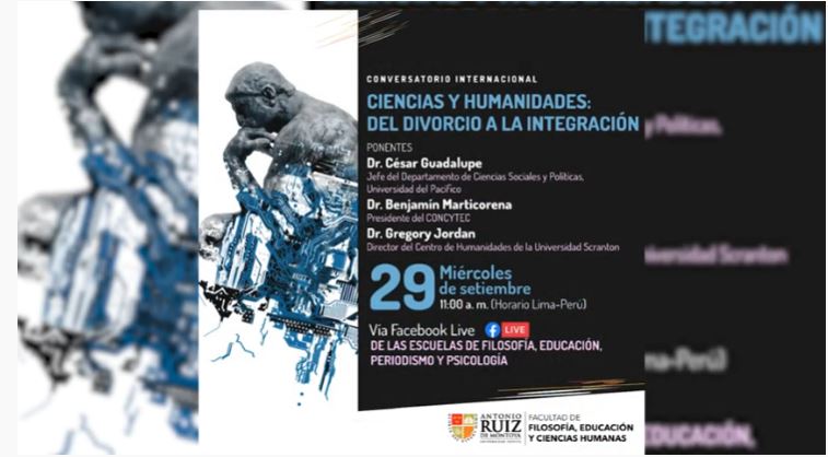 La facultad de Filosofía, Educación y Ciencias Humanas presentó el conversatorio “Ciencias y humanidades: del divorcio a la integración” realizada el 29 de setiembre. En el evento participaron Dr. César Guadalupe, jefe del Departamento de Ciencias Sociales y Políticas de la Universidad del Pacífico; el Dr. Benjamín Marticorena, presidente del CONCYTEC; y el Dr. Gregory Jordan, director del Centro de Humanidades de la Universidad Scranton.