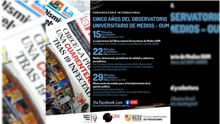 La carrera profesional de Periodismo presentó el Conversatorio Internacional Cinco años del Observatorio Universitario de Medios – OUM, realizado los días 15, 22 y 29 de septiembre. El tema de esta fecha será: “Medios, democracia, periodismo de calidad y cobertura periodística”. Participan Iván Schuliaquer (Universidad Nacional de San Martín- Buenos Aires), Luis Manuel Botello (International Center for Journalists, Washington) y Laureano Checa (Universidad de Chile)