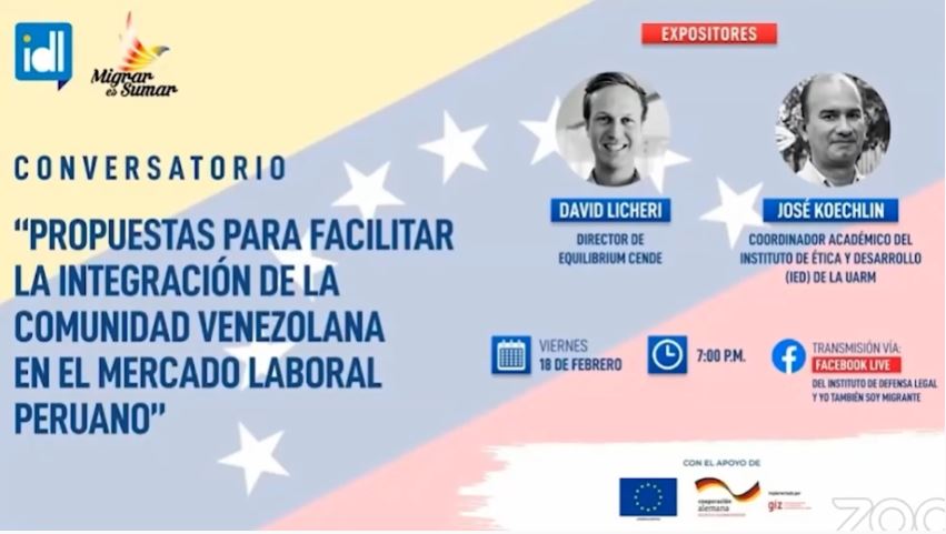 El Instituto de Defensa Legal, junto a la Unión Europea y GIZ, presentó el conversatorio "Propuestas para facilitar la integración de la comunidad venezolana en el mercado laboral peruano", realizado el 18 de febrero. En el evento participaron David Licheri, director de Equilibrium Cende; y José Koechlin, coordinador académico del Instituto de Ética y Desarrollo (IED) de la UARM.