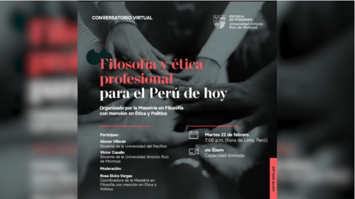La Maestría en Filosofía con mención en Ética y Política de la Escuela de Posgrado de la UARM presentó el Conversatorio Virtual: Filosofía y ética profesional para el Perú de hoy,  el 22 de febrero. En el evento participaron Alonso Villarán, docente de la Universidad del Pacífico; y Víctor Casallo, docente de la Universidad Antonio Ruiz de Montoya. Como Moderadora estuvo Rosa Elvira Vargas, Coordinadora de la maestría.
