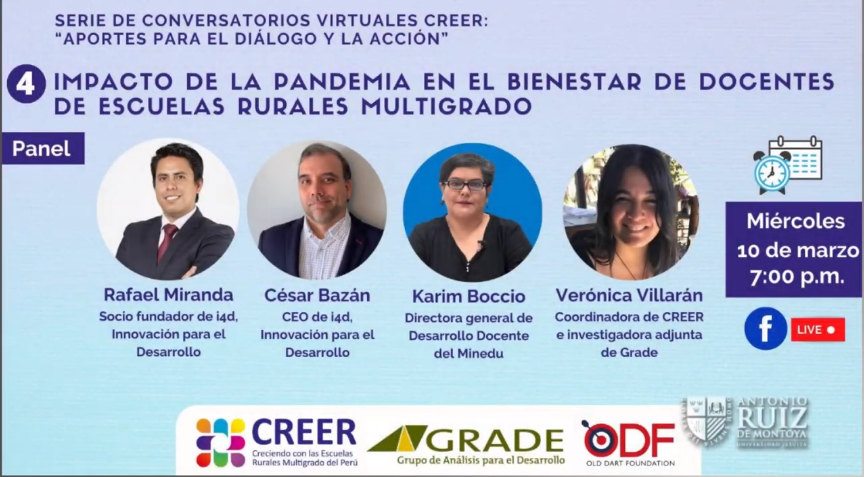 César Bazán, CEO de i4d e Integrante de la Comunidad de Práctica en Habilidades Socio-emocionales (iniciativa de UNESCO Perú, la Universidad Antonio Ruiz de Montoya y la Universidad de Notre Dame), participó en el cuarto conversatorio virtual CREER donde abordó el tema “Impacto de la pandemia en el bienestar de docentes en las escuelas rurales multigrado”. También estuvieron presentes: Rafael Miranda (Socio fundador de i4D, Innovación para el Desarrollo) y Karim Boccio (directora general de Desarrollo Docente del Ministerio de Educación del Perú). Moderó Verónica Villarán (Coordinadora de CREER e investigadora adjunta de Grade).