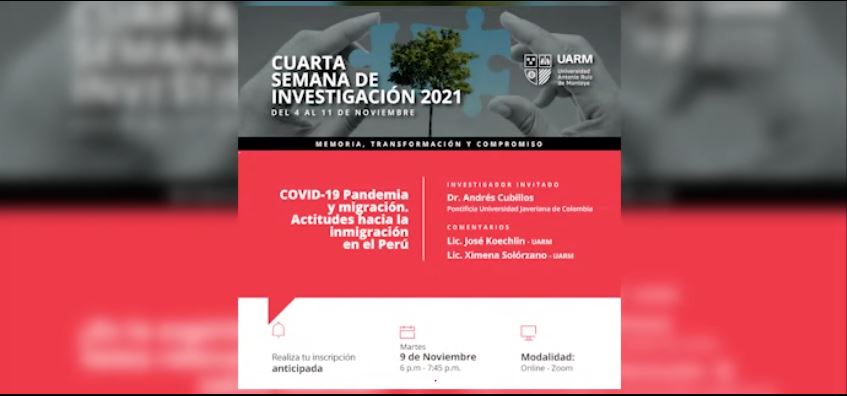 La Dirección General de Investigación de la Universidad Antonio Ruiz de Montoya realizó la Cuarta Semana de Investigación 2021, memoria, transformación y compromiso. En el cuarto día, 9 de noviembre, se presentó “COVID-19 pandemia y migración, actitudes hacia la inmigración en el Perú” en la que estuvo como invitado el investigador Dr. Andrés Cubillos de la Pontificia Universidad Javeriana de Colombia y como comentaristas Lic. José Koechlin y Lic. Ximena Solórzano.