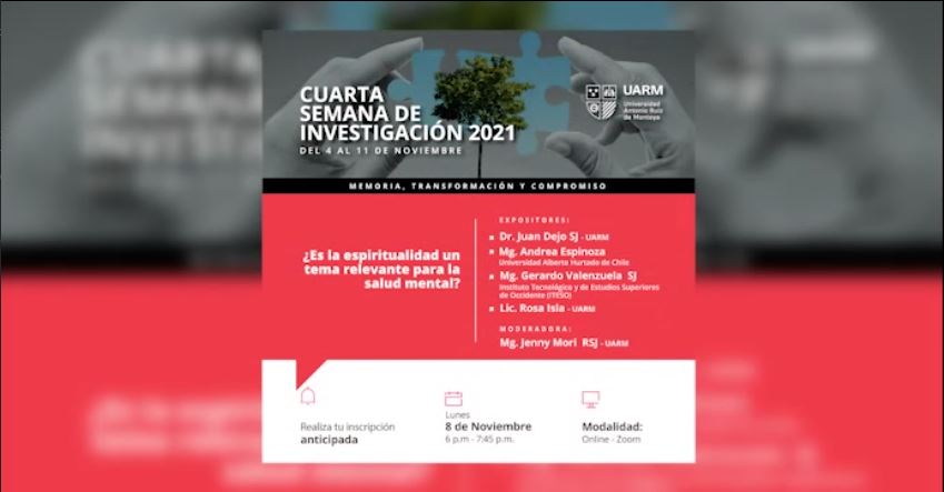 La Dirección General de Investigación de la Universidad Antonio Ruiz de Montoya realizó la Cuarta Semana de Investigación 2021, memoria, transformación y compromiso. En el tercer día, 8 de noviembre, se presentó “¿Es la espiritualidad un tema relevante para la salud mental?” en la que estuvieron como ponentes:  Dr. Juan Dejo SJ (UARM), Mg. Andrea Espinoza (UAH-Chile), Mg. Gerardo Valenzuela SJ (ITESO) y Rosa Isla (UARM)