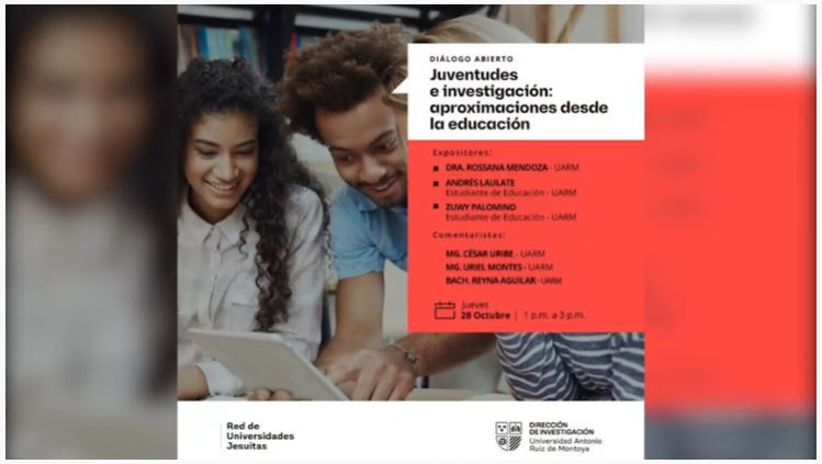 La Dirección de Investigación presentó el Diálogo Abierto “Juventudes e investigación: aproximaciones desde la educación”, realizado el 28 de octure. En el evento participaron la Dra. Rossana Mendoza, docente en la UARM; Andrés Laulate, estudiante de Educación en la UARM; Zuwy Palomino, Estudiante de Educación en la UARM. Y como comentaristas estuvieron Mg. César Uribe de la UARM; Mg. Uriel Montes de la UARM y Bach. Reyna Aguilar de la UARM.