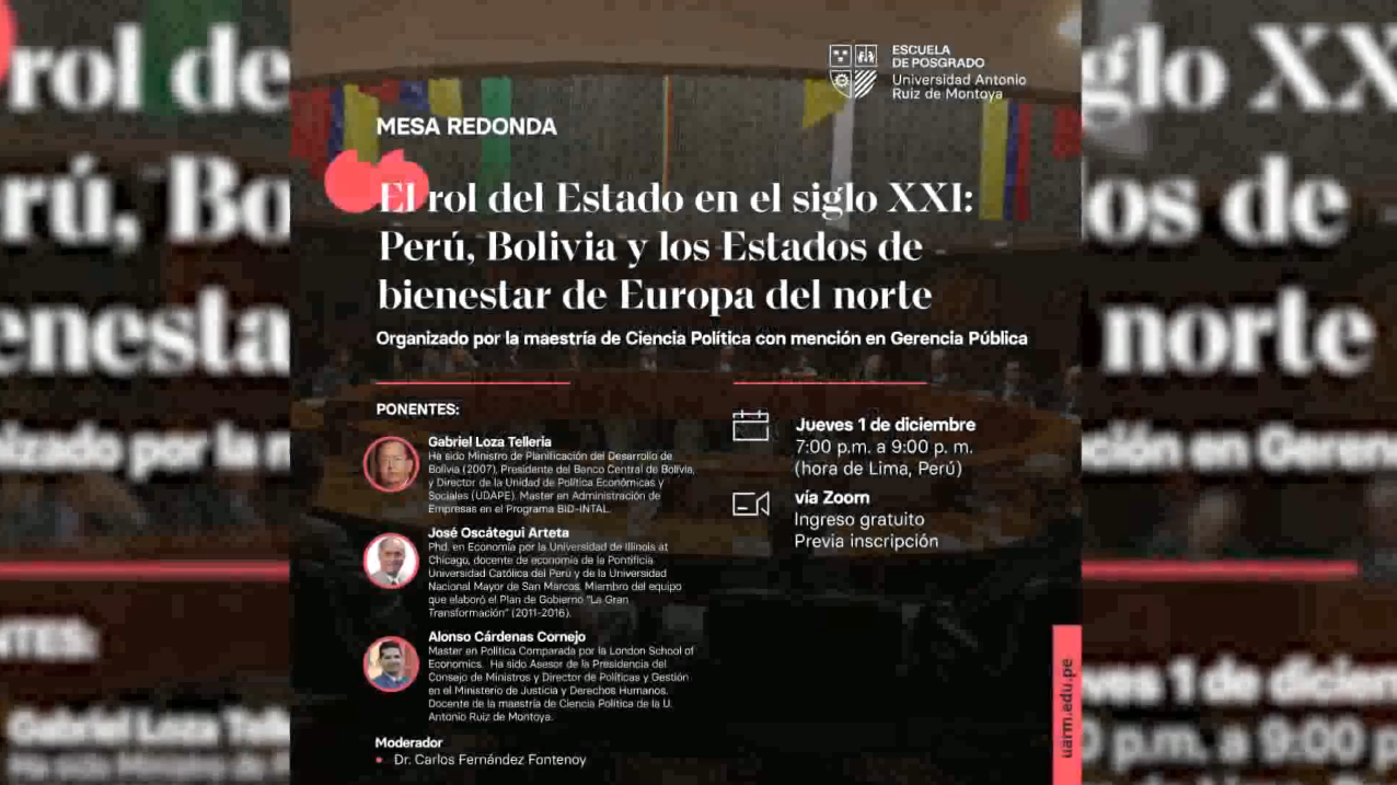 La Escuela de Posgrado de la Universidad Antonio Ruiz de Montoya realizó la mesa redonda " El rol del Estado en el siglo XXI: Perú, Bolivia y los Estados de bienestar de Europa del norte", organizado por la Maestría en Ciencia Política con mención en Gerencia Pública, el 1 de diciembre. El evento contó con la participación de Gabriel Loza Telleria, José Oscátegui Arteta, Alonso Cárdenas Cornejo, y con la moderación de Carlos Fernández Fontenoy, coordinador de la maestría.