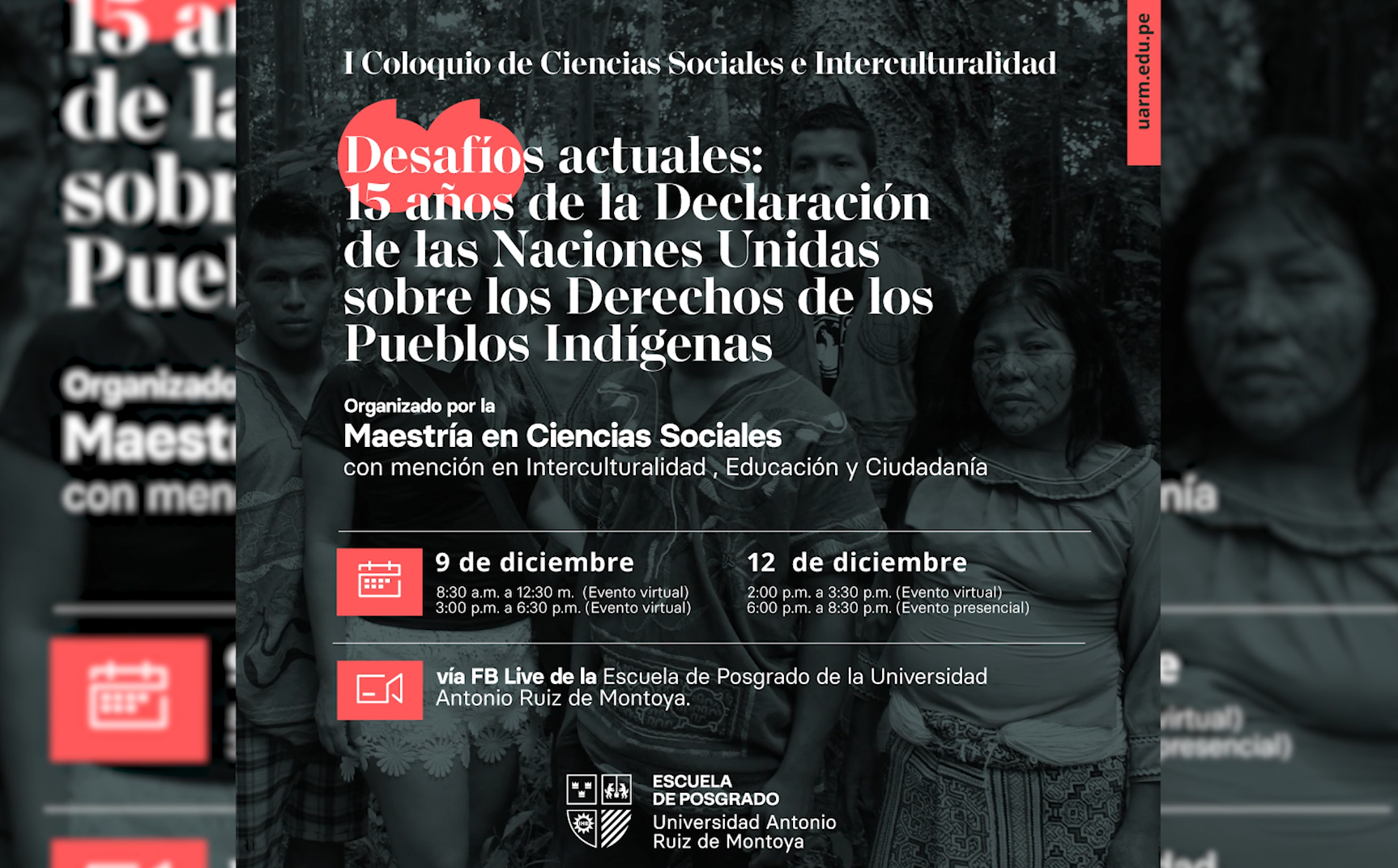 La Escuela de Posgrado de la Universidad Antonio Ruiz de Montoya realizó el I Coloquio de Ciencias Sociales e Interculturalidad: Desafíos actuales: 15 años de la Declaración de las Naciones Unidas sobre los Derechos de los Pueblos Indígenas, organizado por la Maestría de Ciencias Sociales con mención en Interculturalidad, Educación y Ciudadanía. El evento se realizó los días 9 y 12 de diciembre.