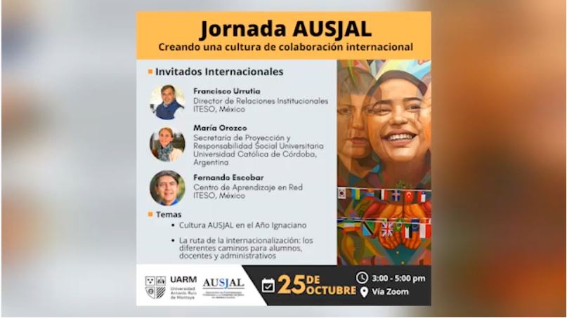 La Universidad Antonio Ruiz de Montoya (UARM) y la red AUSJAL presentaron el evento Jornada AUSJAL: Creando una cultura de colaboración internacional que contó con la participación de Soledad Escalante, jefa de la Oficina de Formación Humanista (OFH) y Enlace AUSJAL, Lauren DeVeau, directora de Relaciones Institucionales y Responsabilidad Social Universitaria, y de Margaret Price, coordinadora de Movilidad Académica. Además, participaron invitados internacionales: Francisco Urrutia, director de Relaciones Institucionales de ITESO (México), María Orozco, secretaria de Proyección y RSU de la Universidad Católica de Córdoba (Argentina) y Fernando Escobar, del Centro de Aprendizajes en Red ITESO (México).