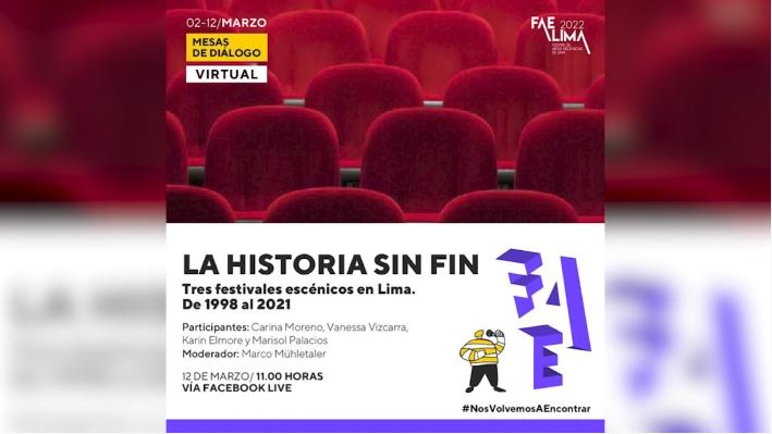 El Festival de Artes Escenicas de Lima presentó la Mesa de Diálogo: La Historia sin fin, el 12 de marzo de 2022. En el evento participaron Carina Moreno, coordinadora del Diplomado en Gestión Cultural de la UARM; Vanessa Vizcarra, Karin Elmore y Marisol Palacios. Como moderador estuvo Marco Mühletaler.