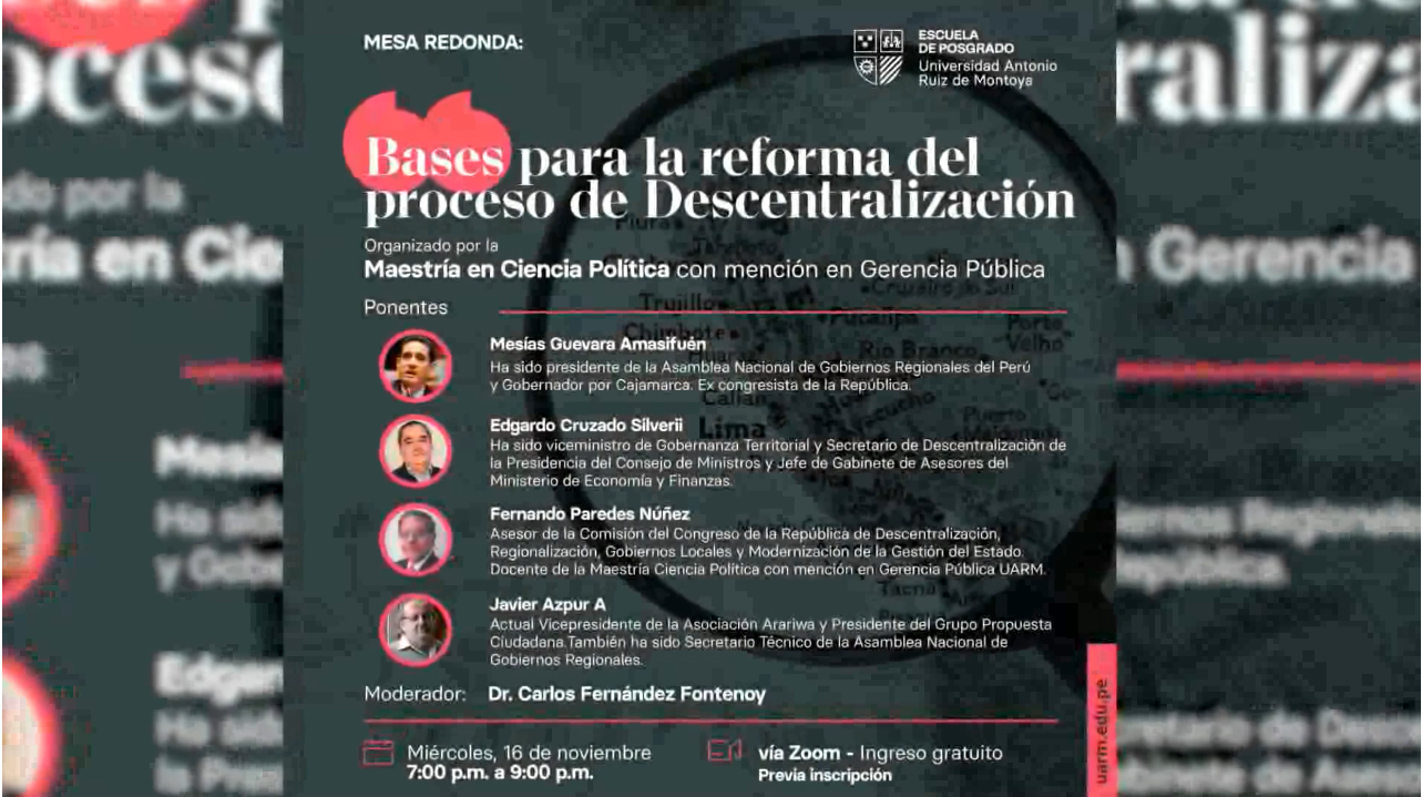 La Escuela de Posgrado de la Universidad Antonio Ruiz de Montoya realizó la mesa redonda "Bases para la reforma del proceso de Descentralización", organizado por la Maestría en Ciencia Política con mención en Gerencia Pública, el 16 de noviembre.