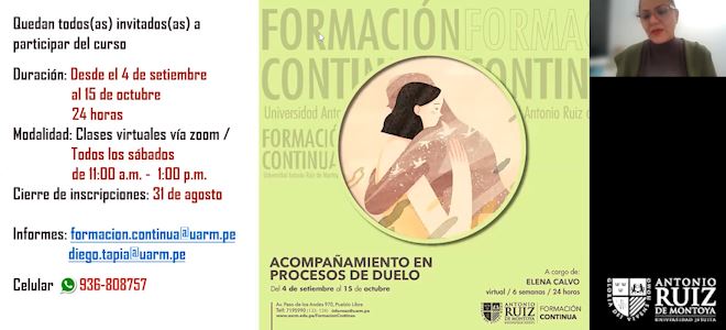 El área de Formación Continua de la Universidad Antonio Ruiz de Montoya organizó el Webinar: ¿Cómo vivir el duelo de manera consciente y saludable?, el 17 de agosto de 2021. La ponencia estuvo a cargo de Elena Calvo, docente del curso de extensión Acompañamiento en procesos de duelo.