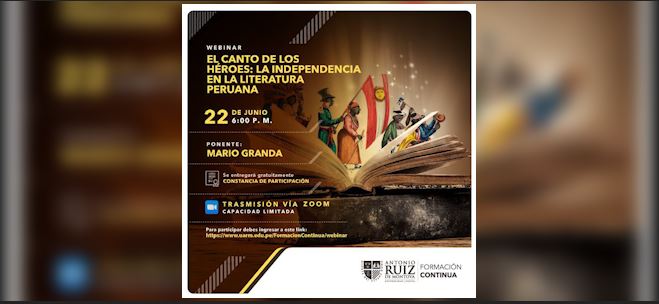 El área de Formación Continua de la Universidad Antonio Ruiz de Montoya organizó el webinar: El canto de los héroes, la Independencia en la literatura peruana, el 22 de junio de 2021 a las 6 p.m. La ponencia estuvo a cargo de Mario Granda, docente del curso de extensión Literatura de la independencia del Perú: letras y utopías.
