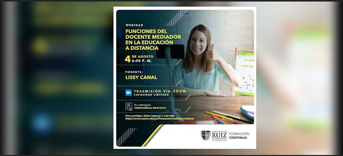 El área de Formación Continua de la Universidad Antonio Ruiz de Montoya realizó el webinar: Funciones del docente mediador en la Educación a Distancia, el miércoles 4 de agosto 2021. La ponencia estuvo a cargo de Lissy Canal, docente del Diploma en Entornos Virtuales de Aprendizaje para la Enseñanza en Educación Inicial.