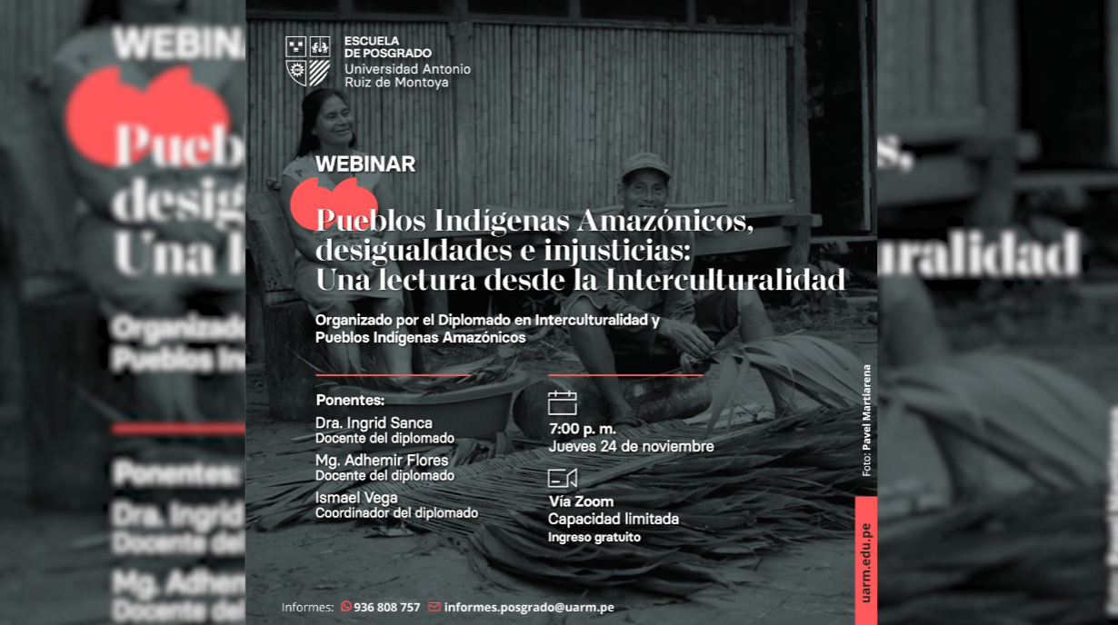 La Escuela de Posgrado de la Universidad Antonio Ruiz de Montoya realizó el webinar "Pueblos Indígenas Amazónicos, desigualdades e injusticias: Una lectura desde la Interculturalidad", organizado por el Diplomado en Interculturalidad y Pueblos Indígenas Amazónicos, el 24 de noviembre.