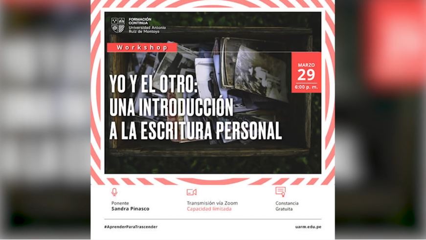 El área de Formación Continua de la Universidad Antonio Ruiz de Montoya presentó el Workshop: "Yo y el otro: una introducción a la escritura personal", el 29 de marzo de 2022. La ponencia estuvo a cargo de Sandra Pinasco. Más información del curso de extensión "Taller de escritura personal: yo y el otro" aquí.